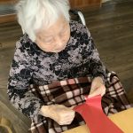 赤と茶色の紙をみなさまに小さくちぎっていただきました😄