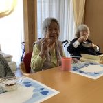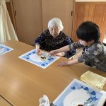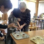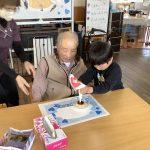 こどもさんたちとクリームを絞るのを一緒にして優しい表情になる入居者様方😄